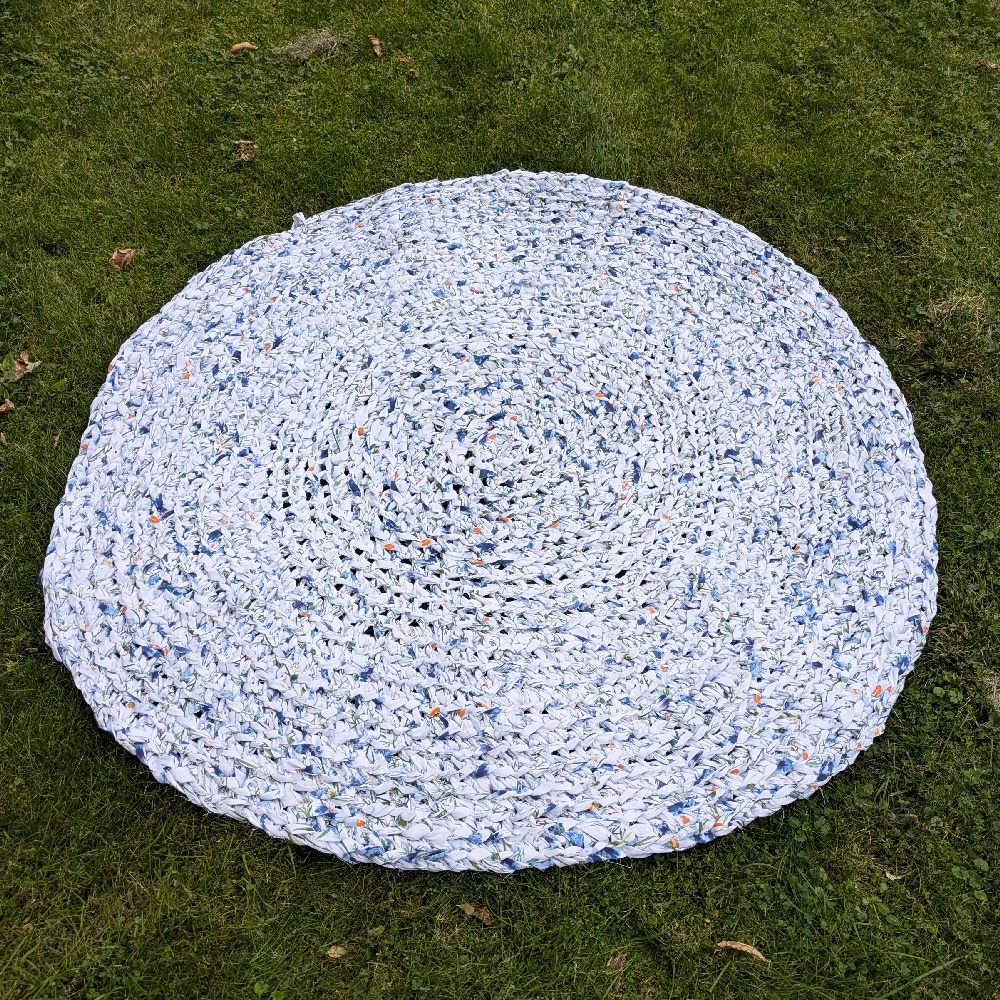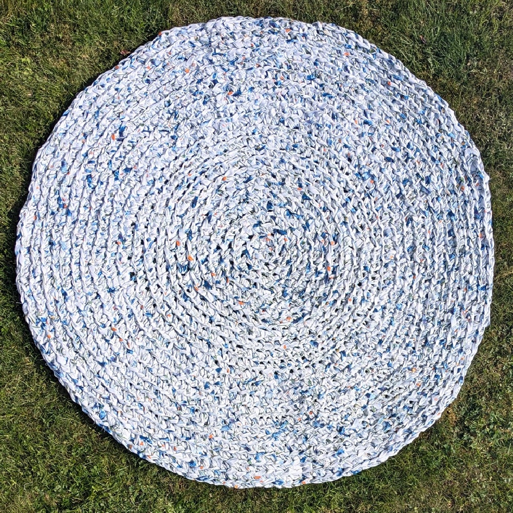 Każdy pasek został ręcznie posortowany, połączony i przerobiony na okrągły szydełkowy dywan w pięknej niebiesko-białej kolorystyce. To niesamowite, jak z małych, niepozornych kawałków może powstać coś tak dużego, praktycznego i pełnego charakteru.