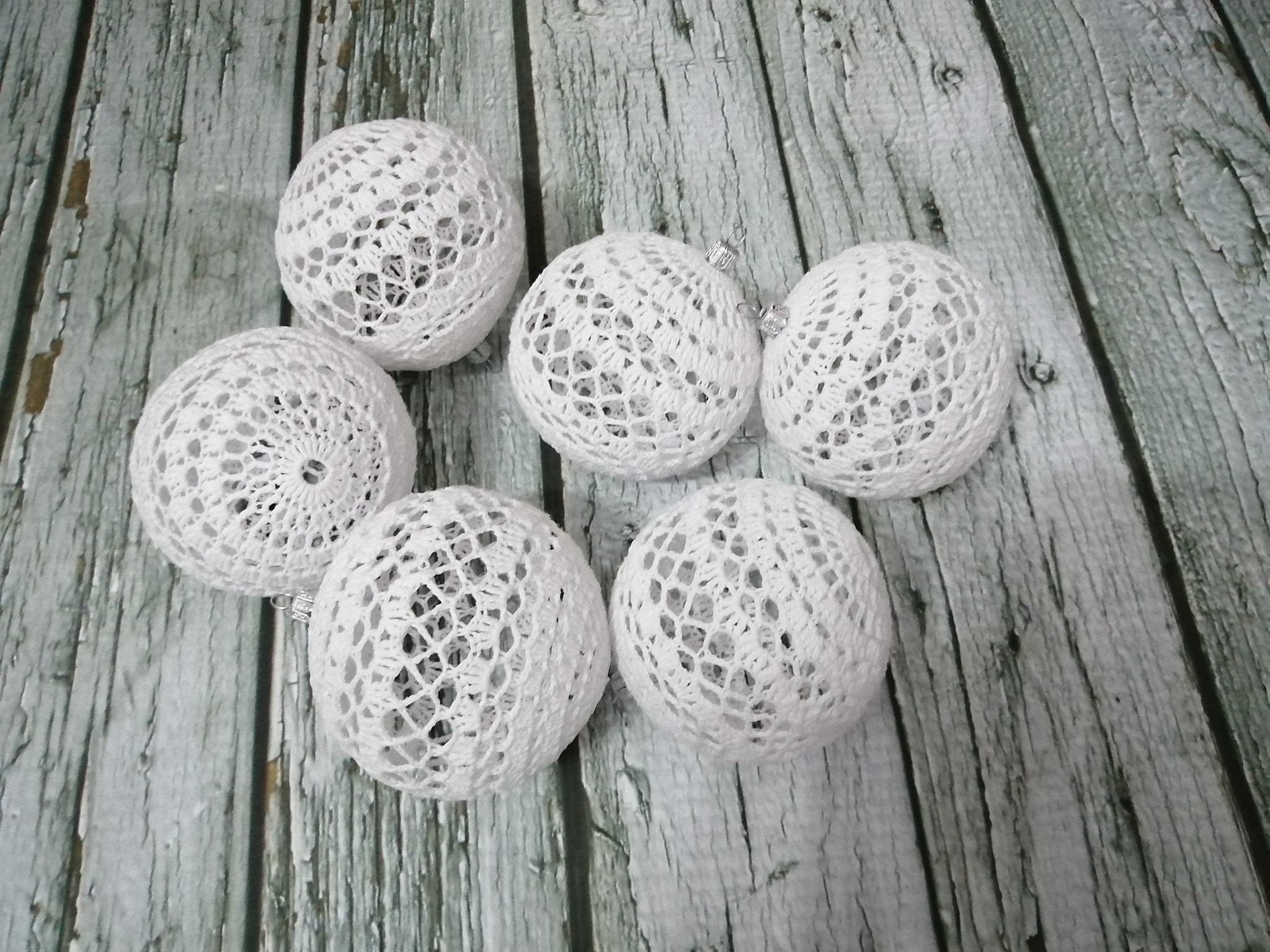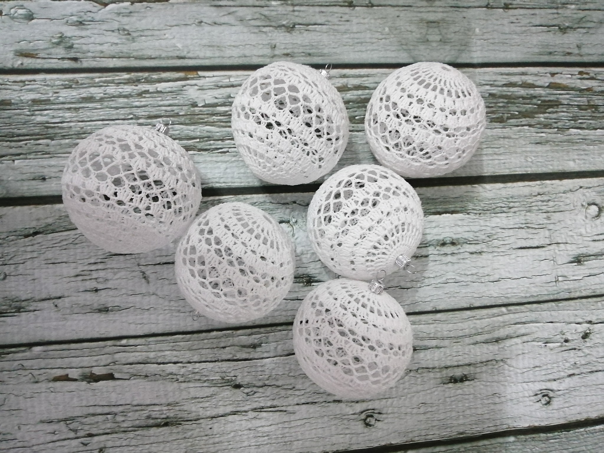 Bombka szydełkowa o średnicy ok. 10 cm z srebrną zawieszką.