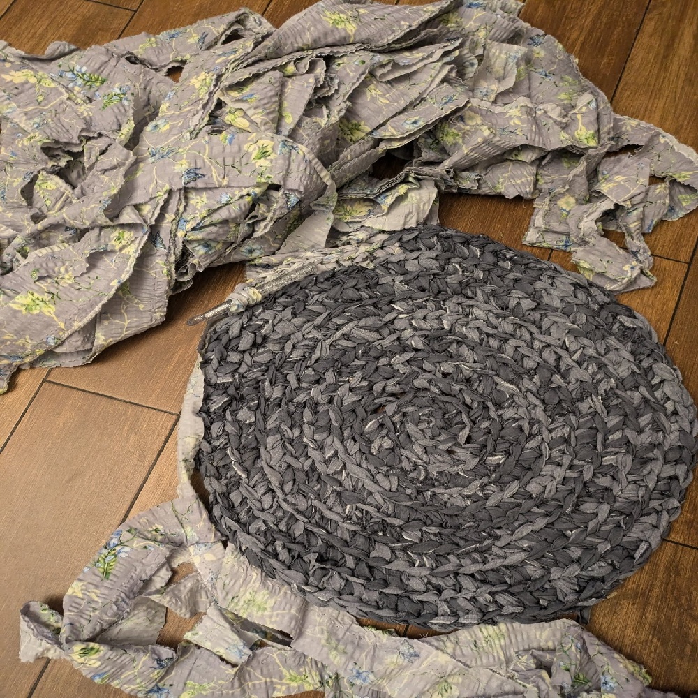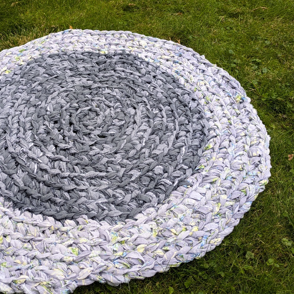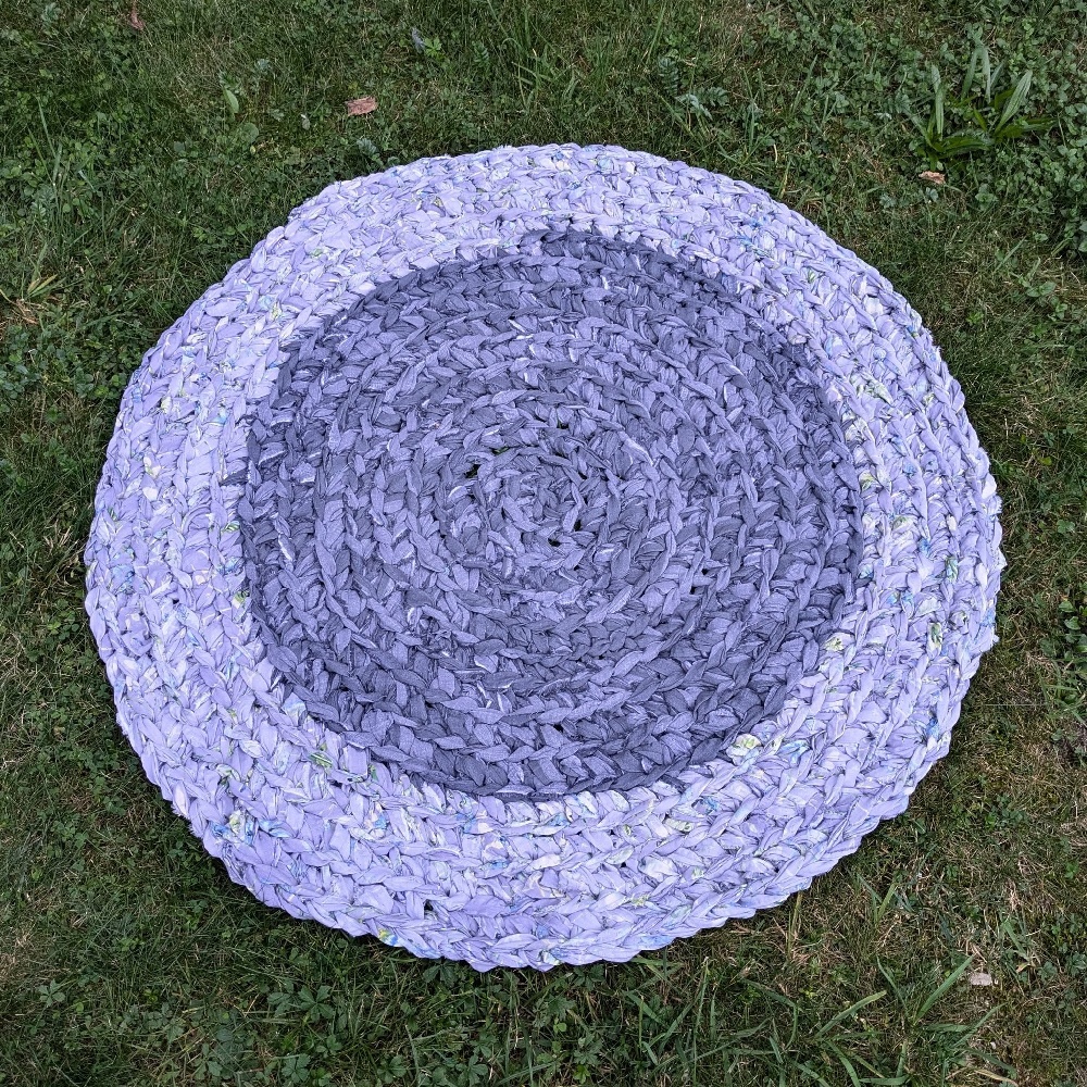 Okrągły dywan szydełkowy, ręcznie wykonany z ścinków tkanin.