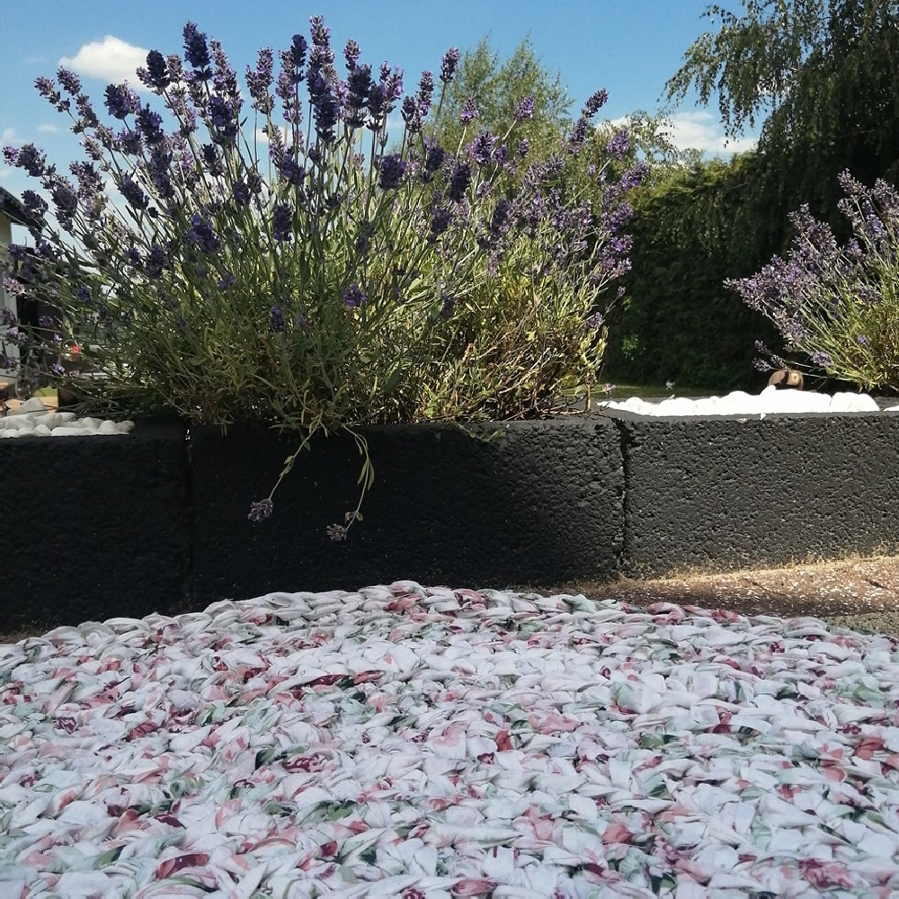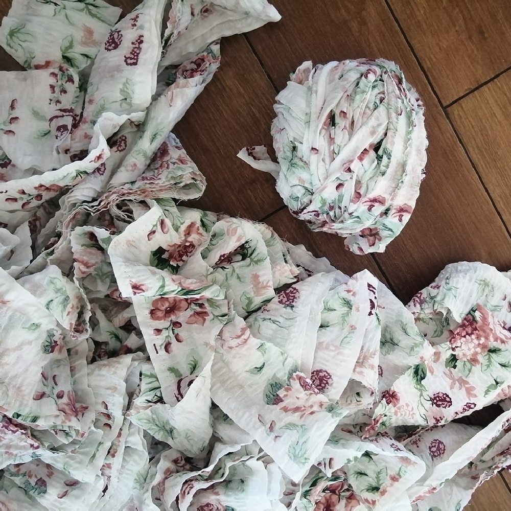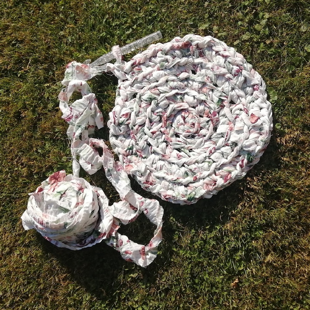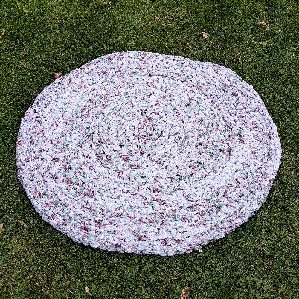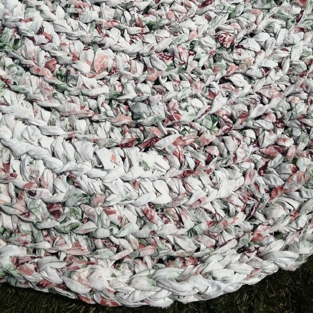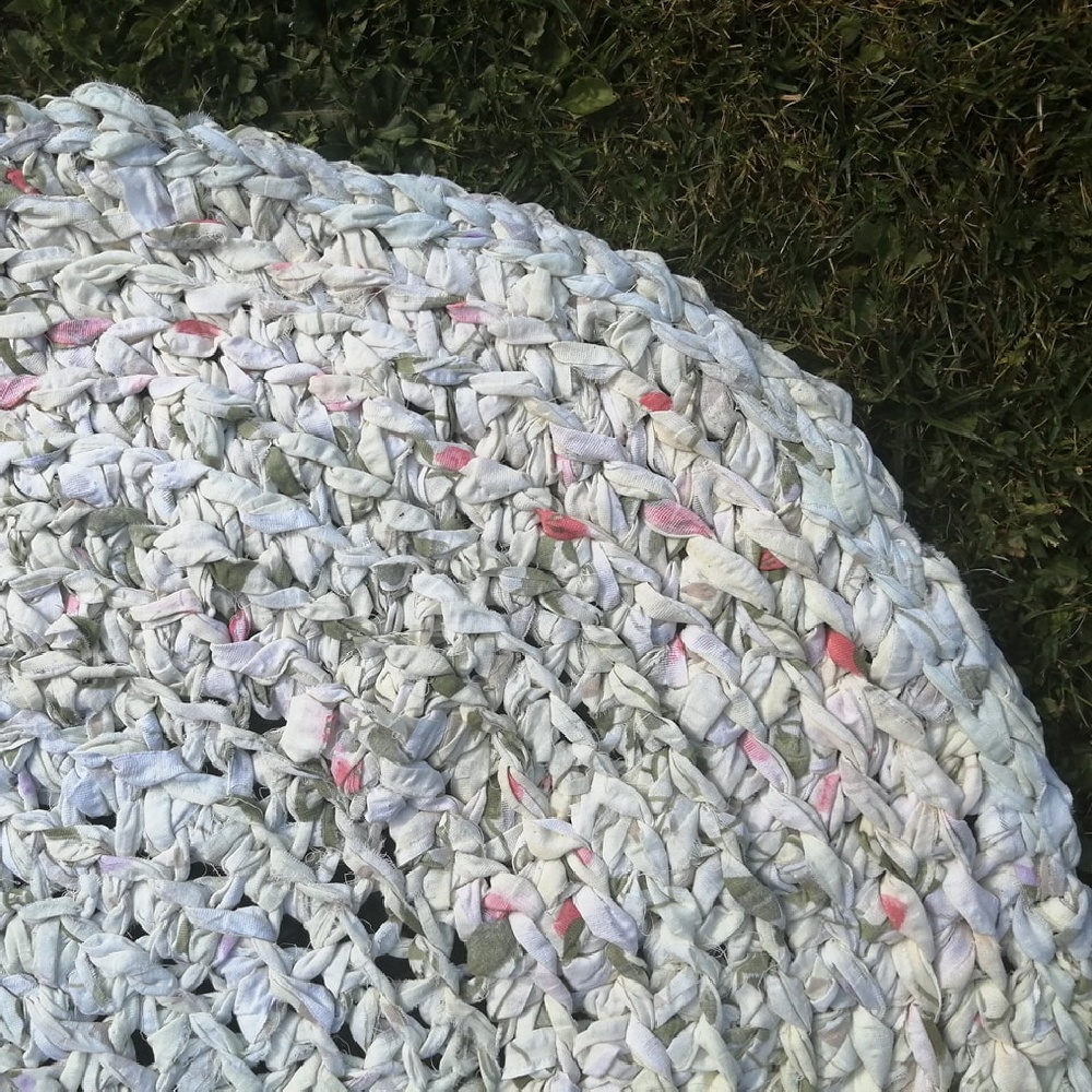 Okrągły dywan szydełkowy, ręcznie wykonany z ścinków tkanin.