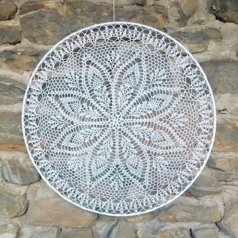 Szydełkowa serwetka na metalowej obręczy.