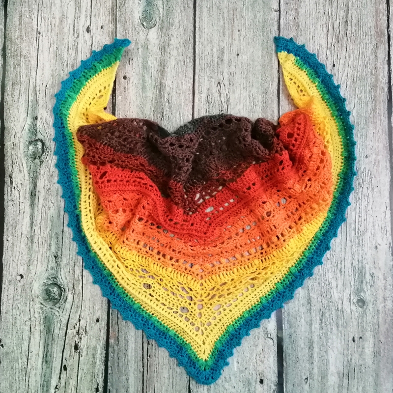 Ta chusta szydełkowa ma piękny gradient kolorów, który przechodzi od ciemnych tonów u góry do jaśniejszych na dole. Kolory układają się warstwowo, zaczynając od ciemnego fioletu lub bordo na szczycie, przechodząc przez odcienie czerwieni, pomarańczu, żółci, aż do niebieskiego i zielonego na końcach. Wzór chusty jest ażurowy, co dodaje jej lekkości i subtelności, a każda sekcja ma delikatny, koronkowy wygląd. Jest to trójkątna chusta, idealna na ramiona, z pięknym, rzemieślniczym wykonaniem.