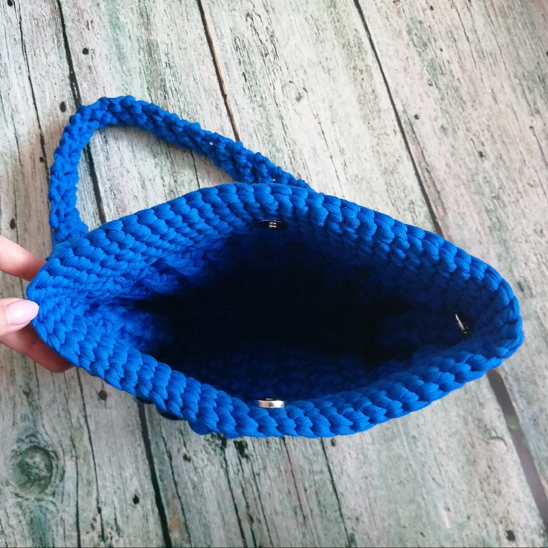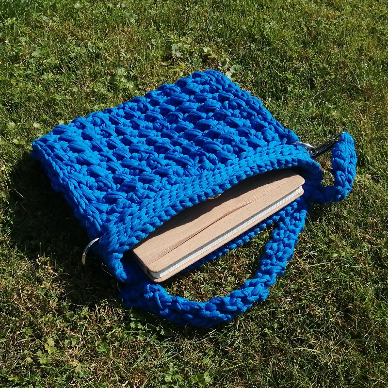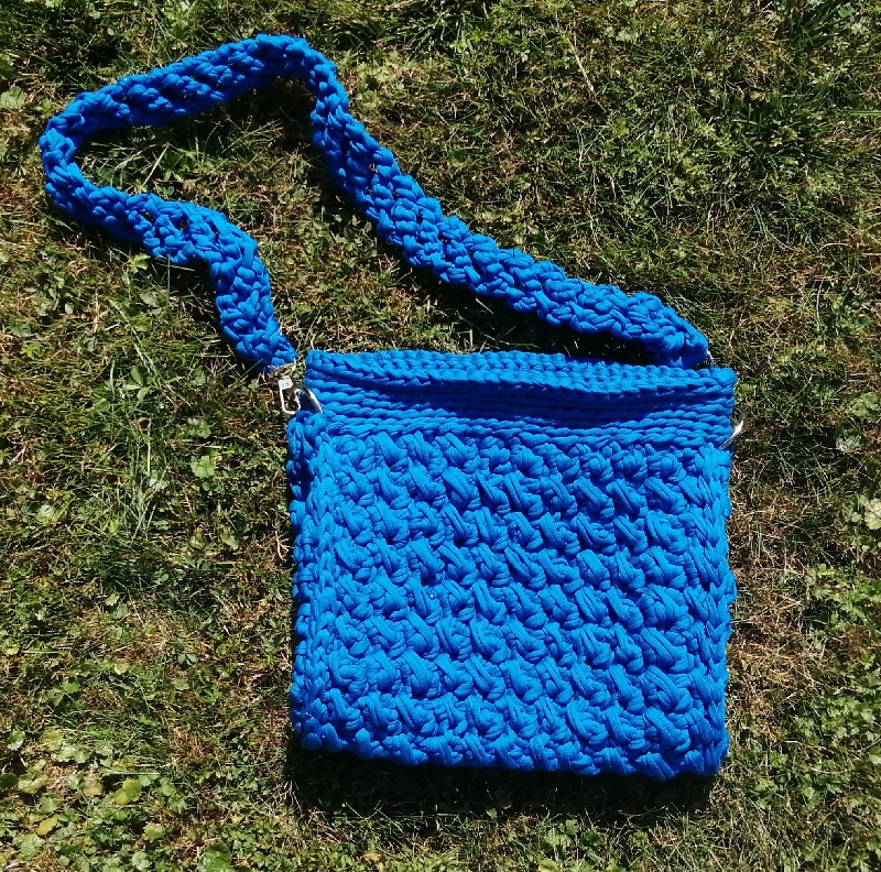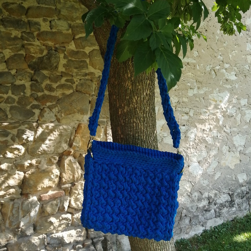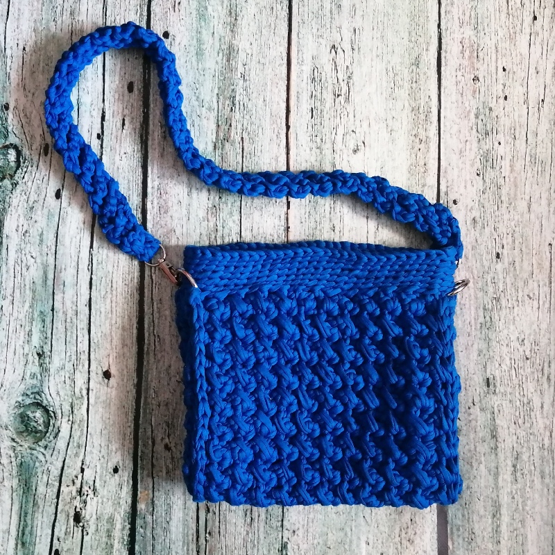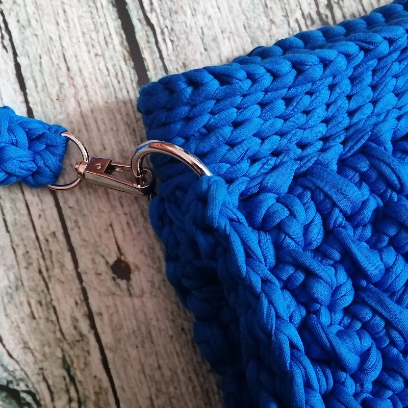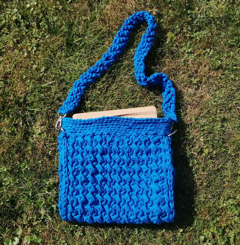 Torebka szydełkowa ma prostokątny kształt i jest wykonana z grubego, niebieskiego sznurka. Wzór na powierzchni torby jest teksturowany, co tworzy efekt warkoczyków lub przeplatanki, co dodaje jej stylowego charakteru. Torba ma długi pasek, również wykonany z tego samego materiału, co umożliwia noszenie jej na ramieniu lub na skos przez ciało. Metalowe kółka na bokach torby łączą pasek z jej korpusem, nadając całości solidny wygląd. Zapinana jest na magnetyczny guzik. Posiada odpinany pasek. Zmieści format A5.
